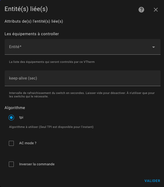 First, configure the main settings common to all VTherms (see main settings). Then, click on the "Underlying Entities" option from the menu, and you will see this configuration page: