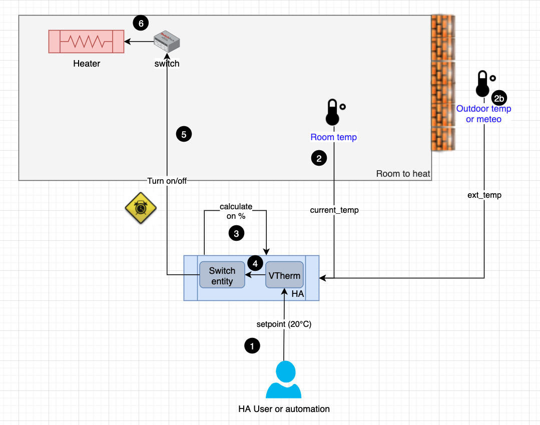 - Based on the setpoint values, the different temperatures, and the TPI algorithm parameters (see TPI), VTherm will calculate a percentage of the on-time.